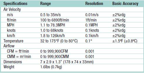風速:0.5~35m/s 溫度:0~80℃ 風量:0~999,900CMM(0.001) 精度:±2%rdg;±0.8℃ 套裝包括:帶120cm長電纜的金屬葉輪探頭,9V電池,保護套,攜帶箱,AC適配器可選