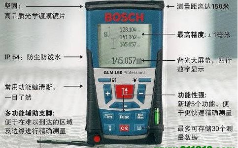 GLM 150激光測距儀范圍達150m,高精度,GLM 150手持式激光測距儀具測量距離、長度、高度、計算面積、體積等功能,