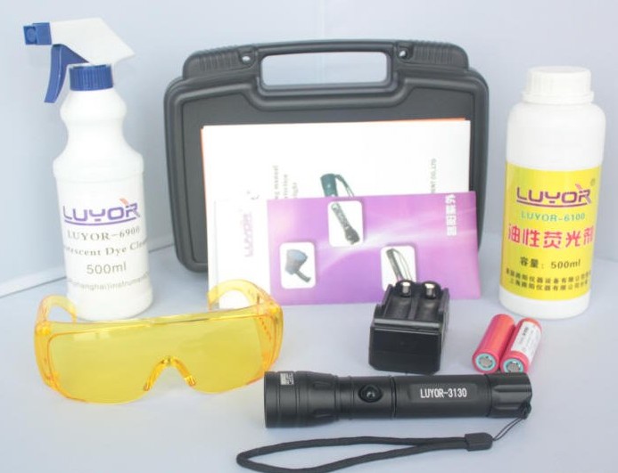 LUYOR-6803熒光檢漏儀套裝包括: 500ml luyor-6100油性濃縮熒光檢漏劑,500ml luyor-6200水基濃縮熒光檢漏劑,500ml染料清洗劑,LUYOR-3130紫外熒光檢漏燈,充電器,充電電池,LUV-30熒光增強防護眼鏡,熒光劑添加標簽,手提箱。
