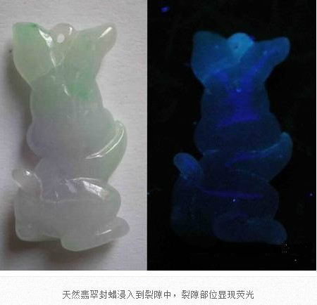 翡翠B貨、B+C貨都經歷了強酸浸蝕、有機膠充填或者充蠟的處理過程。在紫外熒光燈照射下,有機膠和蠟都會發出明顯的紫外熒光,也就是整個翡翠出現均勻的紫外熒光,視為處理翡翠。天然翡翠因不含有機膠和蠟,在紫外熒光燈下不會發出紫外熒光。